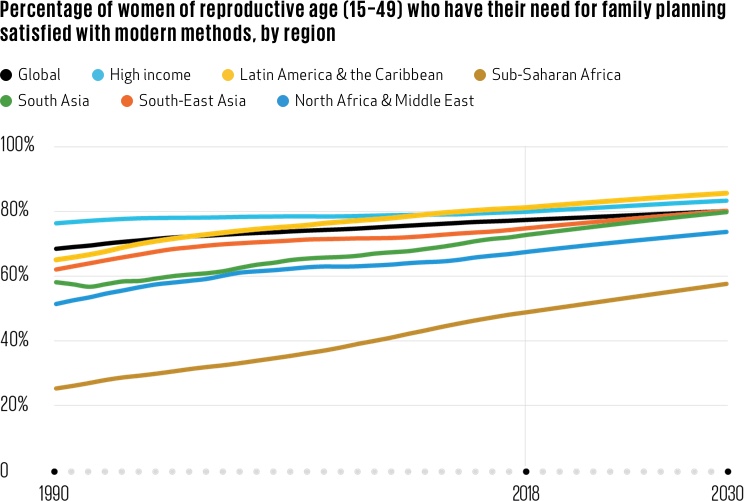 When it comes to family planning, sub-Saharan Africa is a region apart. By now, every other region in the world is clustered near the top of the chart; then there’s a gap, and then comes the line for sub-Saharan Africa. The gap is projected to close, but only gradually. If just a handful of sub- Saharan African countries can speed up their improvement in family planning coverage, then the region will achieve its global targets for meeting women’s needs for contraceptives and reproductive health.